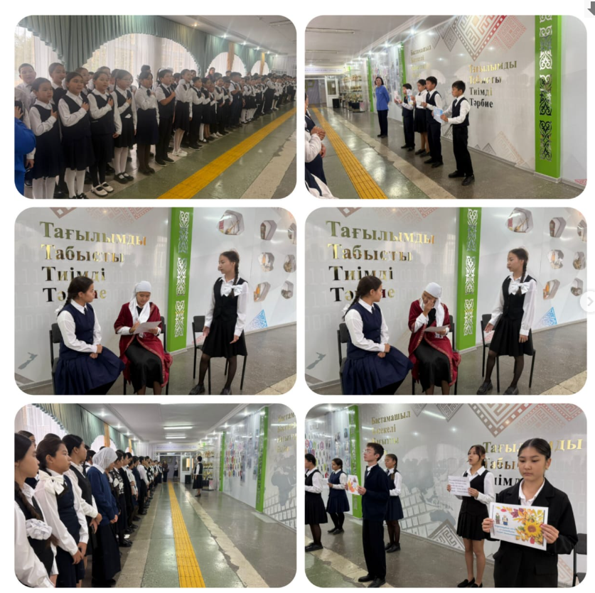 1 – қазан Қарттар күні. 29 қыркүйекте мектебімізде екі ауысымда «Қарттарым – асыл қазынам» атты саптық жиын және бірыңғай сынып сағаттары өтті. Осы күн Біріккен Ұлттар Ұйымы Бас Ассамблеясының 1990 жылғы қаулысымен арнайы белгіленген болатын. Содан бері мереке елімізде кеңінен аталып өтіліп келеді. Негізінен бұл күн – аға ұрпақтың қоғам өміріне қосқан үлесіне шынайы ризашылық білдіретін және қамқорлық көрсететін ерекше мейірімге толы күн.