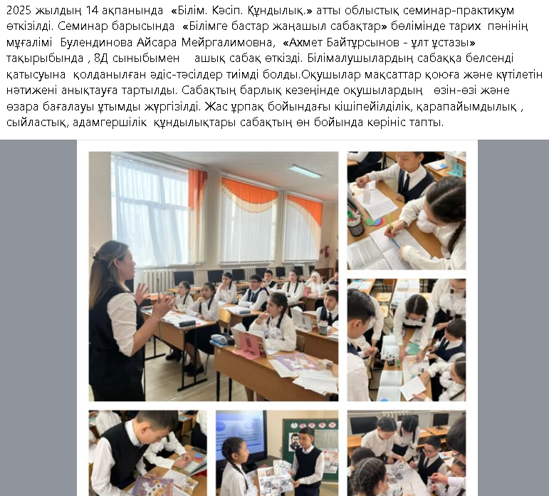 «Білімге бастар жаңашыл сабақтар» бөлімінде тарих пәнінің мұғалімі Булендинова Айсара Мейргалимовна, «Ахмет Байтұрсынов – ұлт ұстазы» тақырыбыMay 8, 2025May 8, 2025 Leave a Reply Cancel replyYour email address will not be published. Required fields are marked *Name * Email * Website Comment * Save my name, email, and website in this browser for the next time I comment.