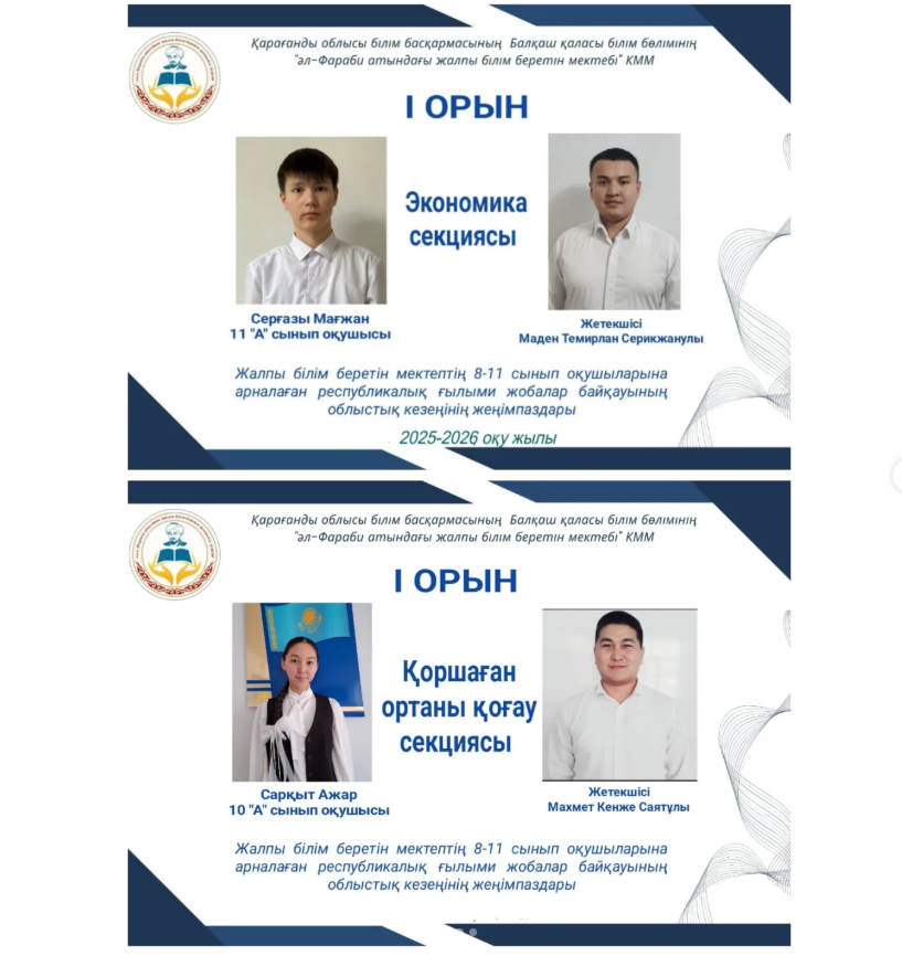 🥇 1 орын — 11 «А» сынып оқушысы Сергазиев Мағжан, жетекшісі Маден Т. С.