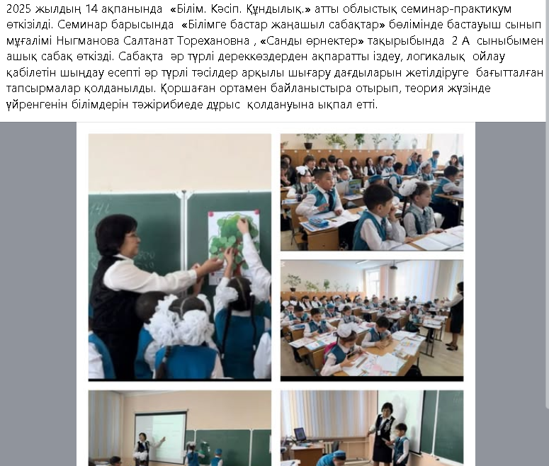 «Білімге бастар жаңашыл сабақтар» бөлімінде бастауыш сынып мұғалімі Ныгманова Салтанат Торехановна , «Санды өрнектер» тақырыбында 2 А сыныбымен ашық сабақ өткізді.May 8, 2025May 8, 2025 Leave a Reply Cancel replyYour email address will not be published. Required fields are marked *Name * Email * Website Comment * Save my name, email, and website in this browser for the next time I comment.