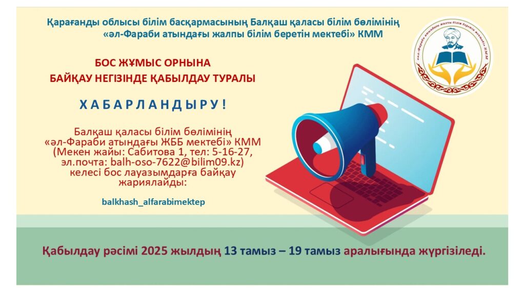Балқаш қаласы білім бөлімінің «әл-Фараби атындағы ЖББ мектебі» КММ (Мекен жайы: Сабитова 1, тел: 5-16-27, эл.почта: balh-oso-7622@bilim09.kz) келесі бос лауазымдарға байқау жариялайды: