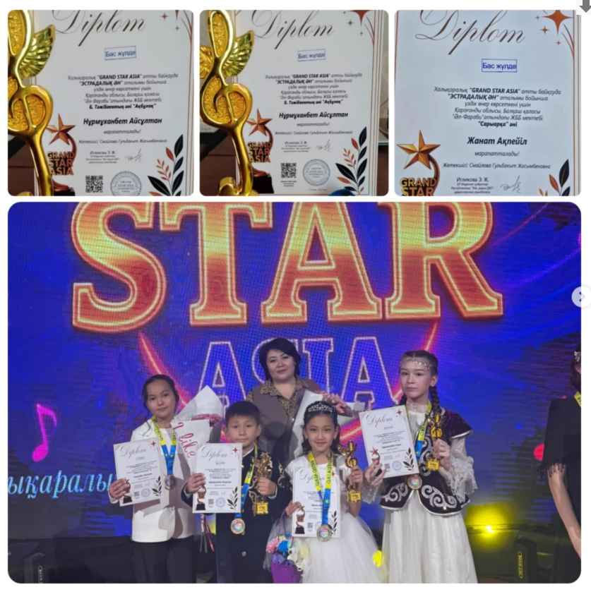 Халықаралық ғылым мен білімді қолдау орталығының ұйымдастыруымен өткен білім саласы қызметкерлеріне арналған «Дарынды балаларға – дарынды ұстаз» атты І республикалық «Grand Star Asia» байқауында «Эстарадалық ән» аталымы бойынша мектебіміздің оқушылары Жанат Ақпейіл, Нұрмұханбет Айсұлтан, Нұрмұханбет Ұлжан бас жүлдеге ие болды. Құттықтаймыз!!! Жетекшісі Смайлова Гүлбақыт Жасымбекқызы. Сонымен қатар ұйымдастырушылар белсенділік танытқаны үшін мектебімізді Алғыс хатпен және арнайы кубокпен марапаттады.Құтты болсын!!!