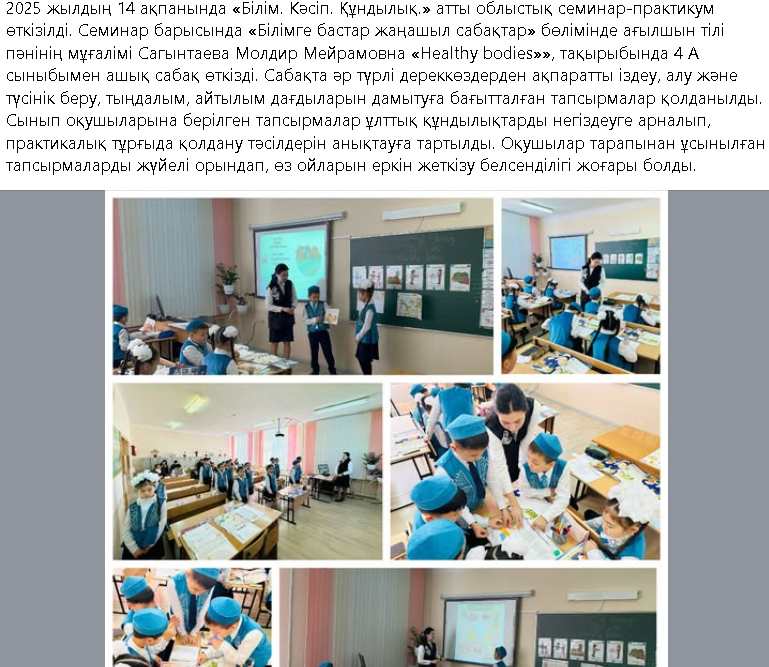 Семинар барысында «Білімге бастар жаңашыл сабақтар» бөлімінде ағылшын тілі пәнінің мұғалімі Сагынтаева Молдир Мейрамовна «Healthy bodies»», тақырыбында 4 А сыныбымен ашық сабақ өткізді.May 8, 2025 Leave a Reply Cancel replyYour email address will not be published. Required fields are marked *Name * Email * Website Comment * Save my name, email, and website in this browser for the next time I comment.